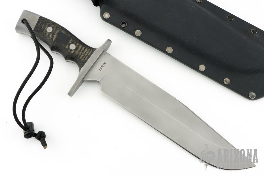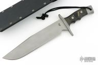 This Bowie by Dennis Phillips features a bead blasted blade with false top edge, .238" blade stock and 2.010" blade depth, full tang construction. The handle has a bead blasted stainless steel guard and rear bolsters, black canvas micarta scales, lanyard hole. Comes with a kydex sheath. Has a few light scuffs, otherwise excellent condition.