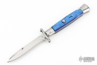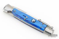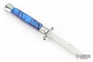 This Swing Guard Lockback Auto by AKC Italy has a polished stainless steel spear point blade with false top edge. The handle has blue acrylic scales with stainless steel bolsters, liners, and stainless steel back spacer and lock.  Includes original box and a nylon sheath. Excellent Condition.