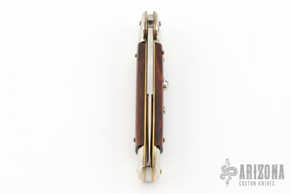 This Picklock by Frank Beltrame features a mirror polished spear point blade with false top edge. The handle has nickel silver bolsters, front and rear, wood scales, brass liners, stainless spring.  Limited edition 2023 on the tang of the blade on the backside. Excellent condition.