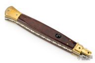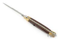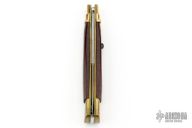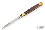 This Picklock Auto by Armando Beltrame features a Damascus bayonet style blade with a false top edge. The handle has fileworked brass bolsters, snakewood scales with fileworked brass liners, fileworked stainless steel backspacer. Excellent condition. Dated 2000 and #28/50. This knife was customized by Arlin "SloJoe" Walker, he did the filework, scales, and button.