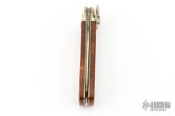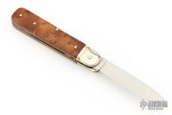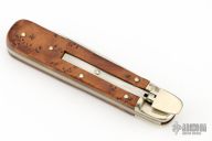 This Boker Leverlock features a drop point blade. The handle is comprised of nickel silver bolsters and burl wood scales over brass liners and stainless steel backspring. Has some a crack in one of the scales, excellent condition otherwise.
