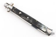 This 13" swivel bolster features a polished dagger ground blade. The handle has stainless steel bolsters, front and rear, horn scales, brass liners, stainless spring. Excellent condition.