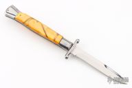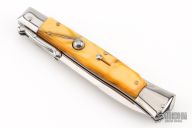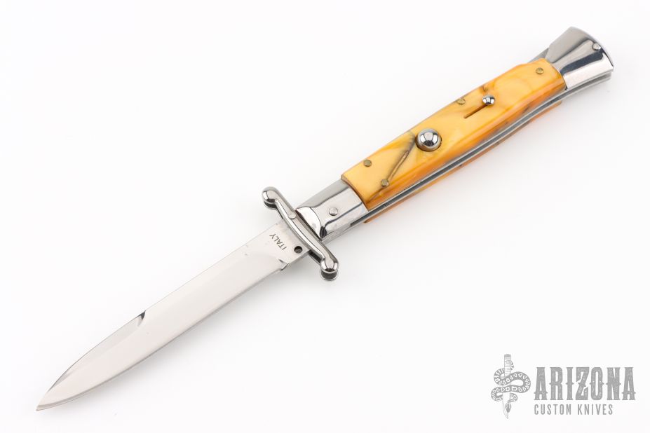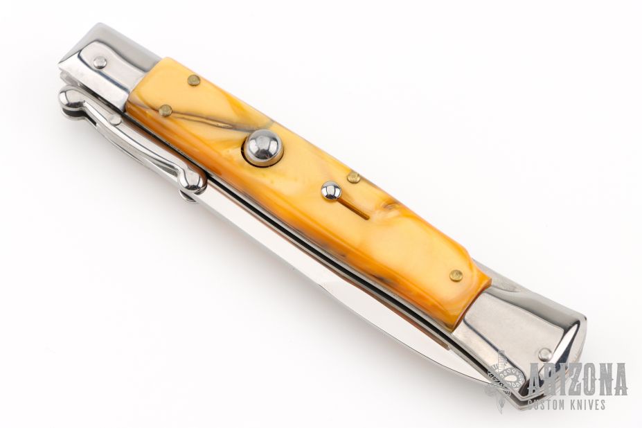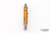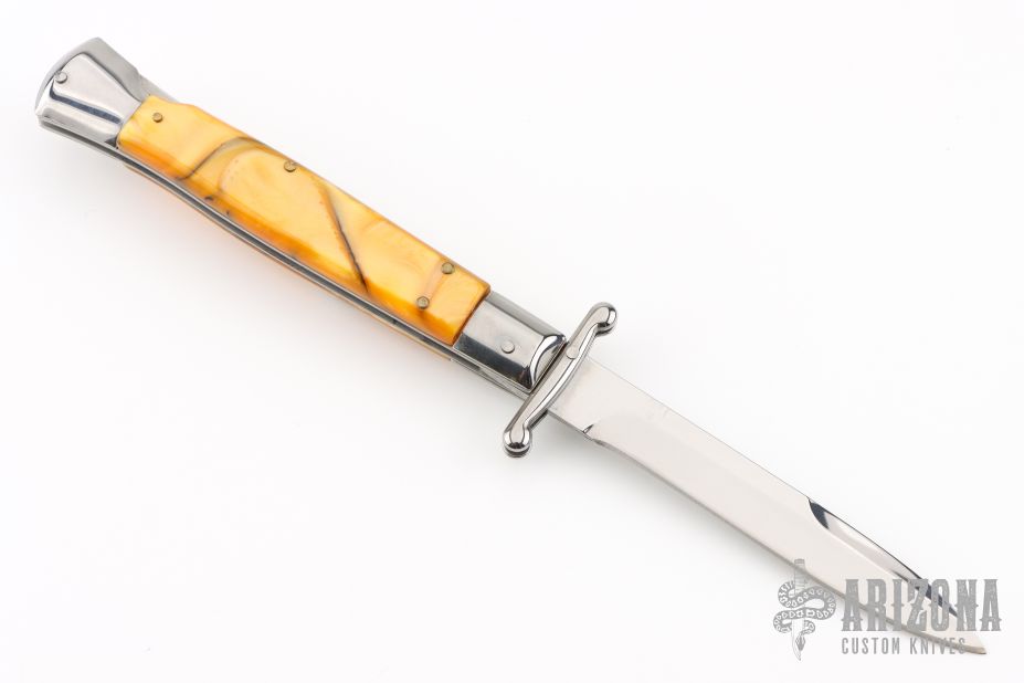 This Swing Guard Lockback Auto by AKC Italy has a polished stainless steel spear point blade with false top edge. The handle has orange acrylic scales with stainless steel bolsters, liners, and stainless steel back spacer and lock. Excellent Condition.