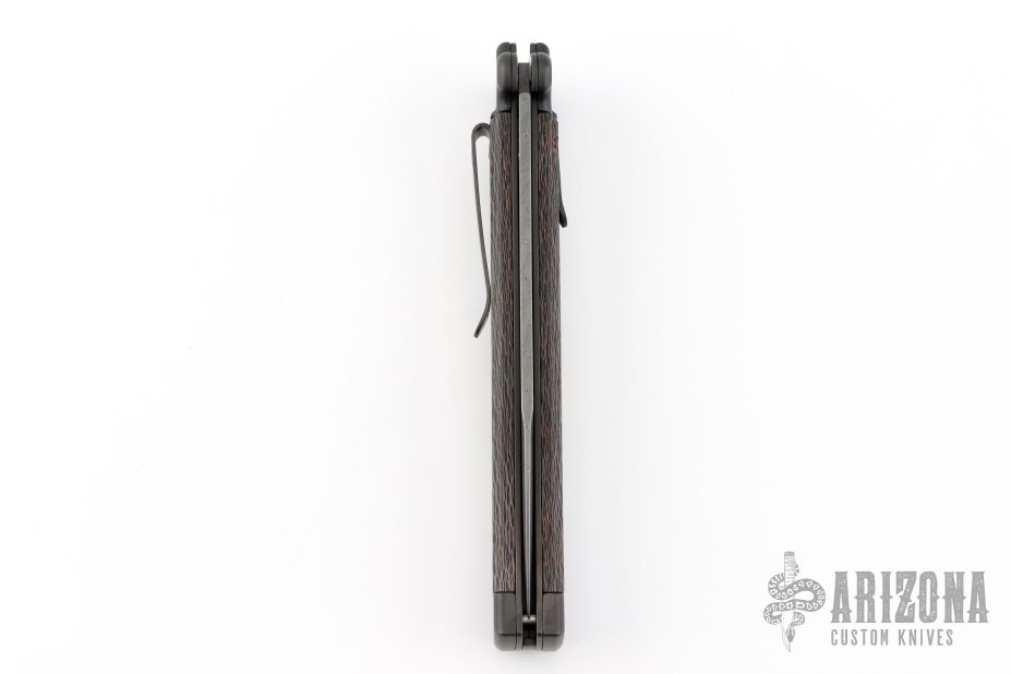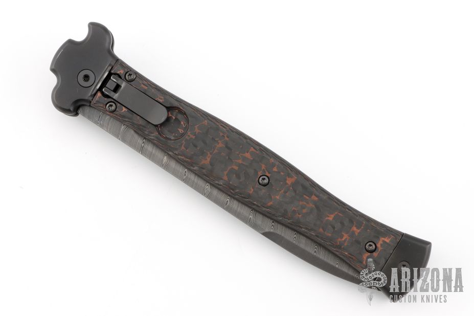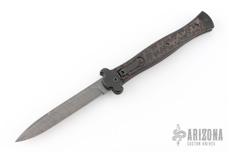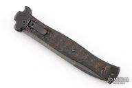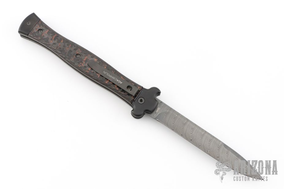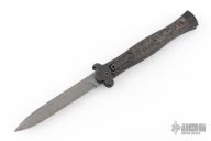This Zero model features a dragon skin carbon fiber handle and a Damascus dagger blade. The AGA Campolin Zero automatic offers Italian-made craftsmanship at it's very finest. This model is characterized by a flawless fit and finish, rock solid blade lock up, and snappy automatic deployment. The Zero is definitely not your grandpa's Italian stiletto, with dragon skin carbon fiber scales, black stainless steel bolsters, and a Damascus blade with a false top edge. A stainless steel tip-down pocket clip finishes off the solid EDC design. Comes with tube and papers. Excellent condition.