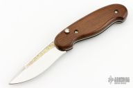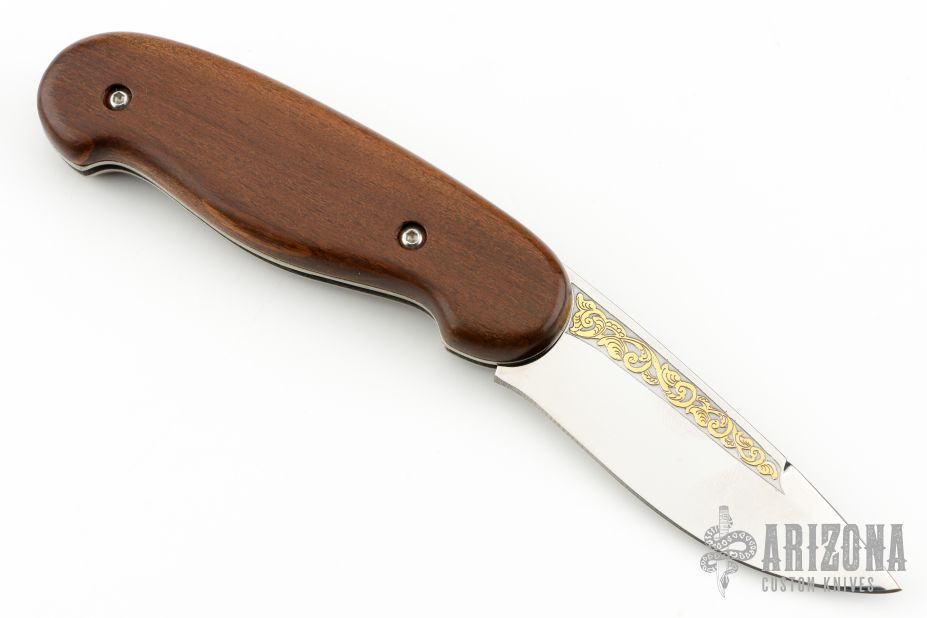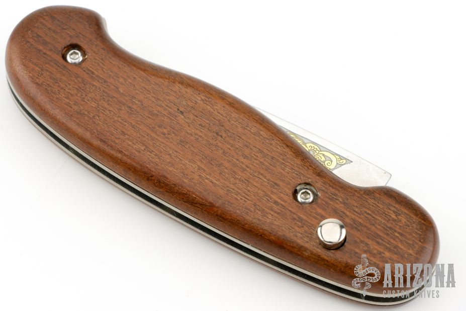 This Side Opening Auto features a mirror polished blade with patterned flats with gold coloring. The handle has wood scales, stainless steel liners. Has a couple light scratches, otherwise excellent condition.