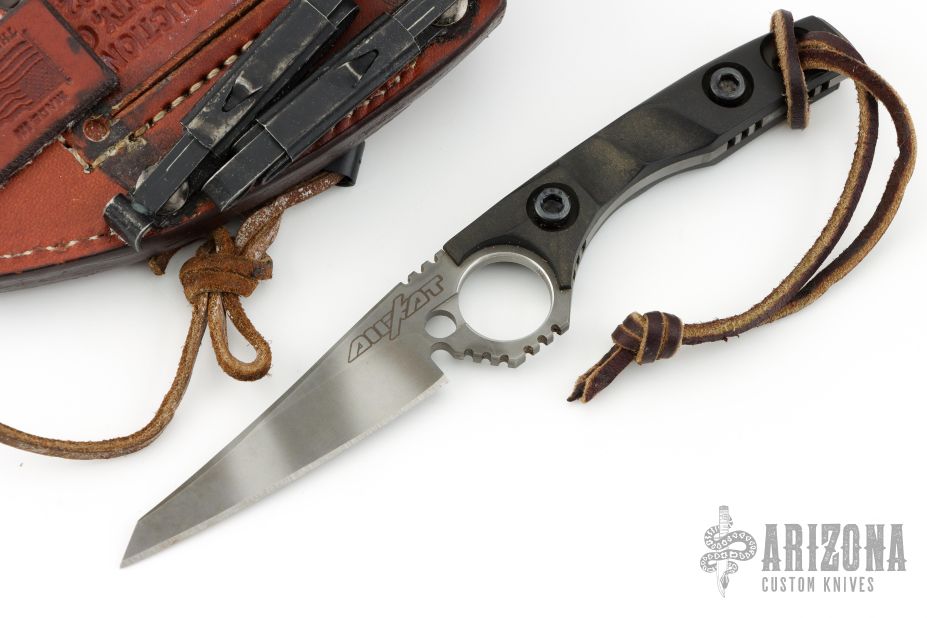 This Ringed Airkat by Dwaine Carrillo features a tiger stripe finished blade with a notched thumbrest, .150" blade stock and .902" blade depth, full tang construction. Hollow ground blade. The handle has black paper micarta scales with black screws. Comes with brown leather sheath with sharpening stone and a gut hook companion blade. Has some scuffs, otherwise excellent condition.