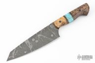 Santoku-spalted tamarind, black G10, brass and grey G10 Pin Striping, Turquoise with gold web Tru-stone split, cl pins and a smooth grip.  .085" Blade Stock.  1.934" Blade Depth.  Acid Splash and stone washed finished blade.  Full tang construction.  Includes a padded zippered case.  Excellent Condition.