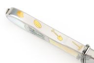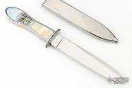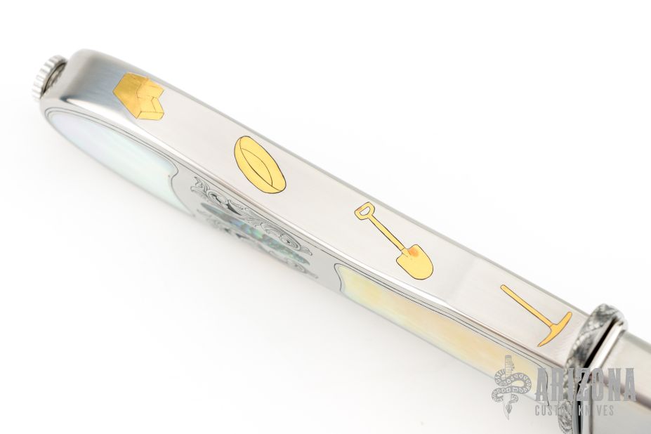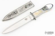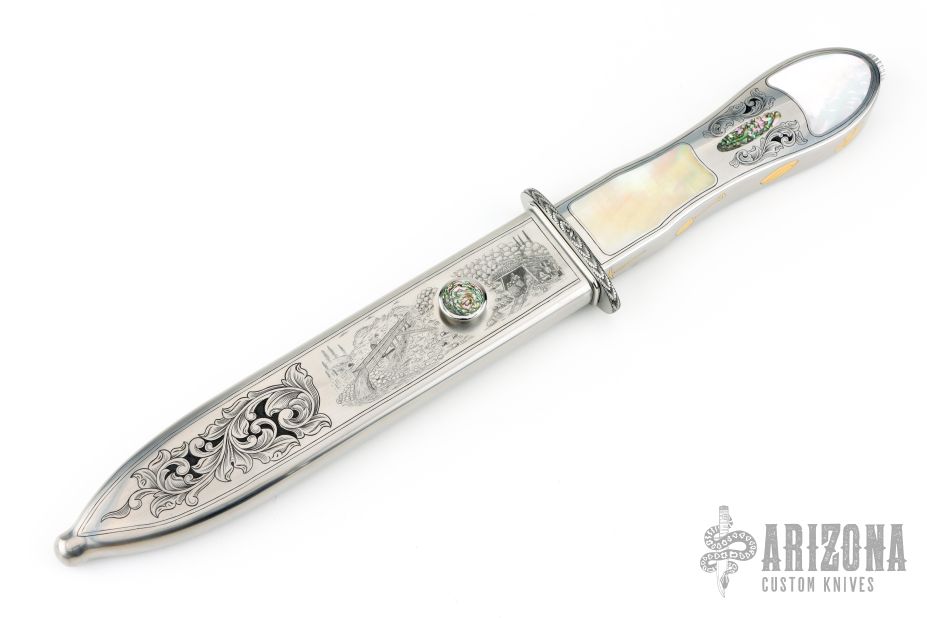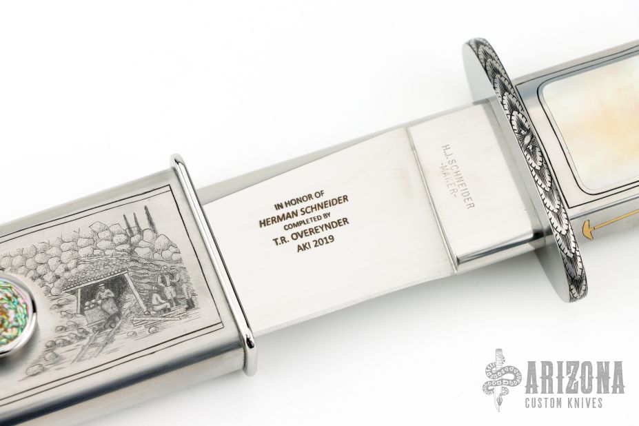 This knife by Herman J Schneider was finished by Tommy Overeynder after Herman's death for the 2019 Art Knife Invitational. He said that he "received it in the ground and in heat-treated condition. I added a tang bolt, stainless steel guard and integral handle also of 416 stainless inlaid with premium gold lip pearl and abalone shell. I also made a full metal scabbard using 410 stainless. The engraving was done by the talented Joe Mason portraying a California gold rush theme. Completed in honor of Herman."