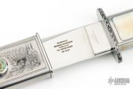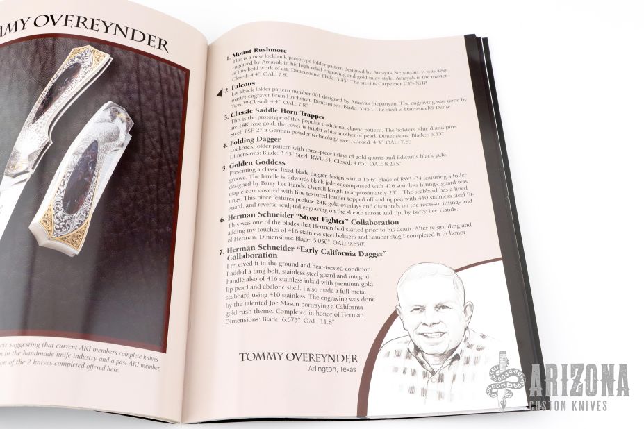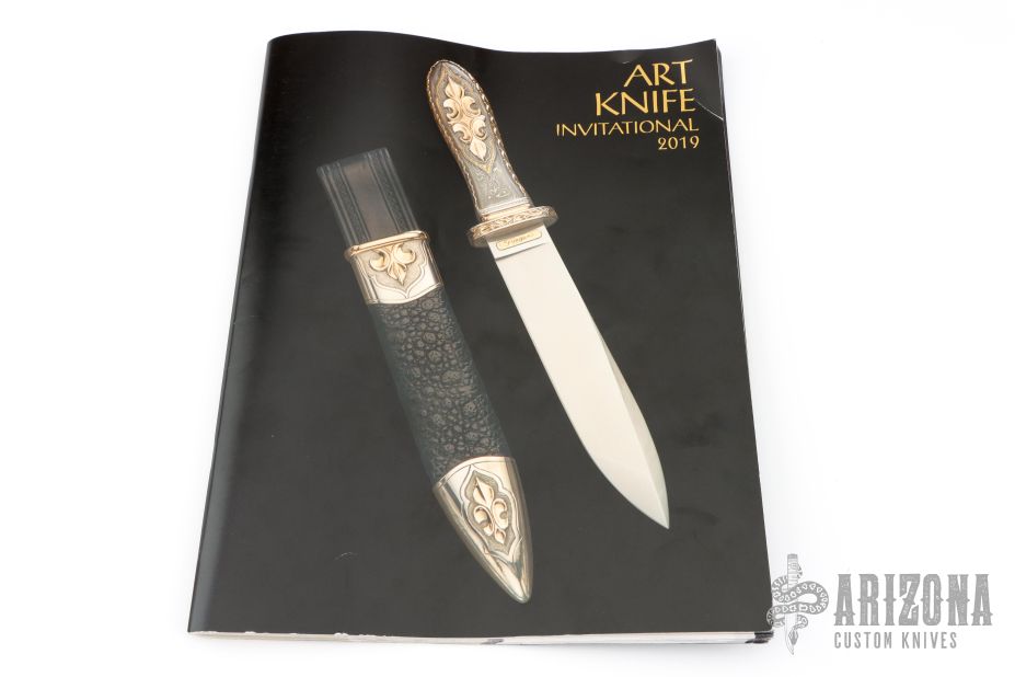 It has a hand rub satin finished blade with false top edge, .259" blade stock and 1.158" blade depth, hidden tang construction. The handle has an engraved 416 stainless steel guard and integral handle with gold lip pearl and abalone inlays, custom tang screw with abalone inlay. The engraving was done by Joe Mason and has 24k gold inlays. Comes with a 410 stainless steel scabbard also engraved by Joe Mason. Comes with the 2019 AKI Catalog where it is mentioned on page 34. The blade reads "In honor of Herman Schneider Completed by T.R. Overeynder AKI 2019. Excellent condition. Comes with a zippered case with embroidered description on the front.