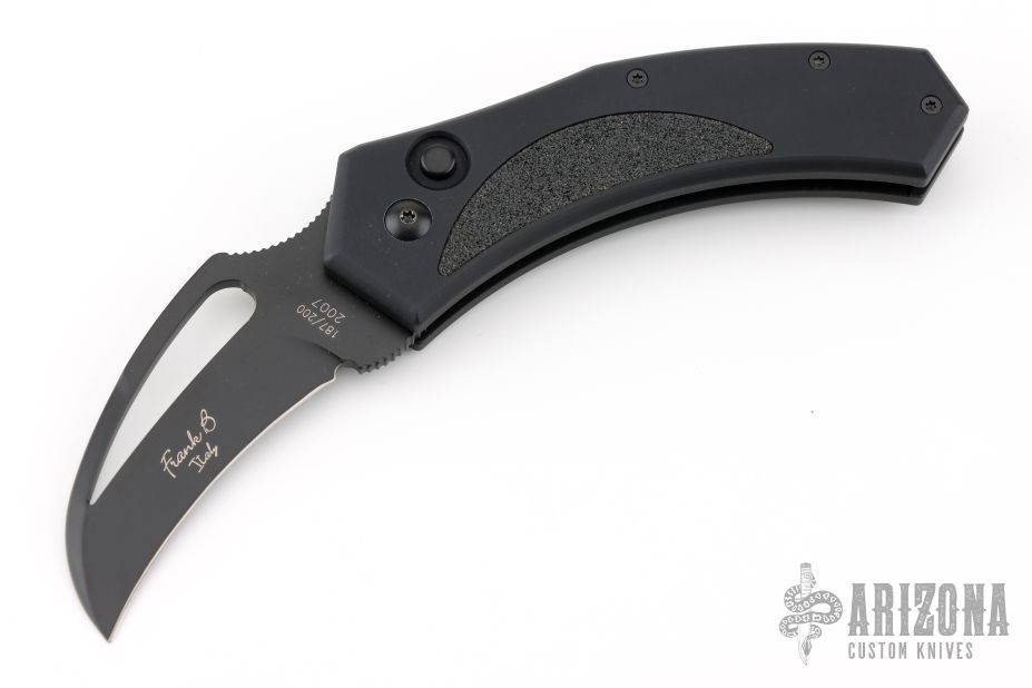 This AutoHawk by Frank Beltrame is #187 of 200 for this 2007 limited release. Black blade with notched thumbrest, black aluminum handle, tip up stainless steel clip. Excellent condition.
