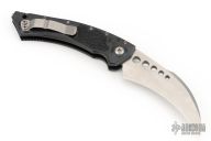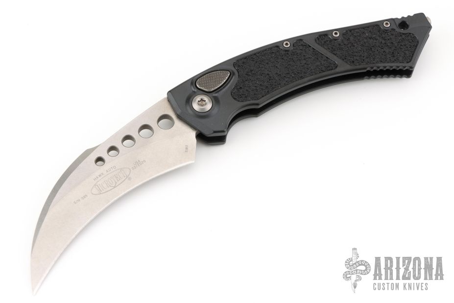 This Hawk Auto by Microtech Knives features a stonewashed hawkbill blade. The handle has a black aluminum frame with blasted stainless steel hardware and tip up clip. Dated 02/2020 and s/n 595. Excellent Condition. Comes with a Microtech box and papers.