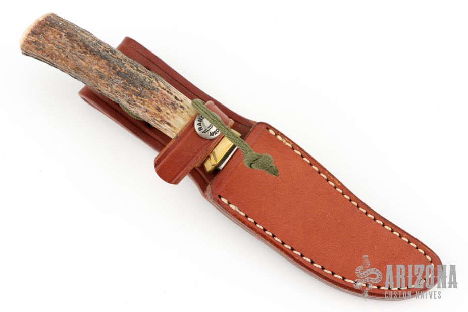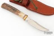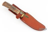 This knife has a satin finished blade with sharpened top edge, .144" blade stock and .833" blade depth, hidden tang construction. The handle has a reduced brass hilt with red, white and blue spacers and a stag grip. Comes with a brown leather sheath. Has some light scratches and oxidation spots, has been sharpened, otherwise good condition. Has "LB" on the blade.