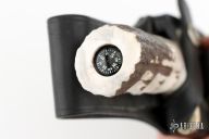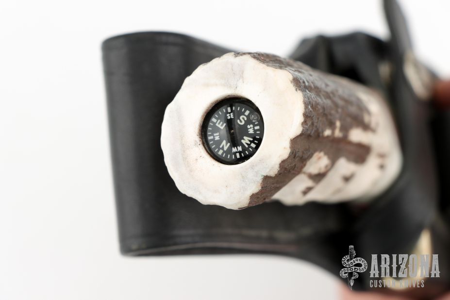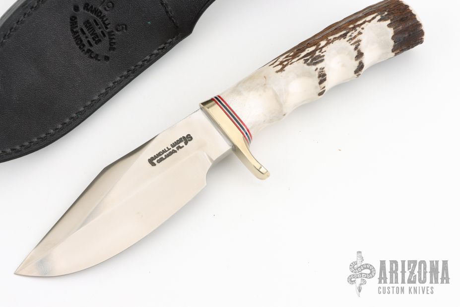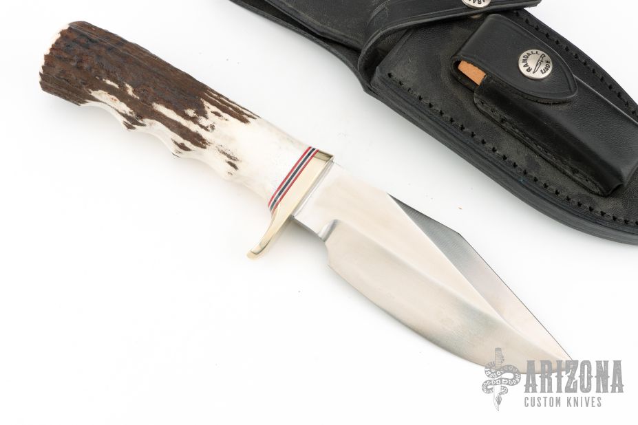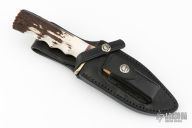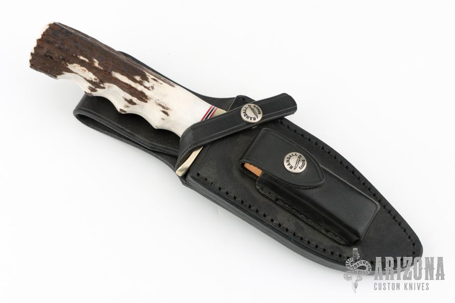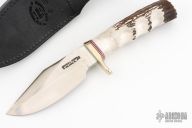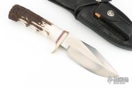 This knife has a satin finished stainless steel blade, with sharpened top edge and notched thumbrest, .236" blade stock and 1.695" depth, hidden tang construction. The handle has nickel silver guard and a stag handle with finger grips, red/white/blue spacers, compass in the butt. Comes with a black leather sheath. Excellent condition.