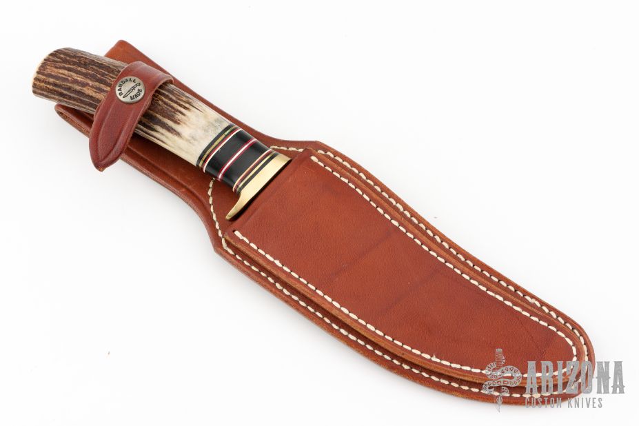 The Model 27 is an ideal all-around heavy-duty sportsman's knife. This knife has a carbon steel blade, .216" blade stock and 1.385" blade depth, hidden tang construction. The handle has a brass guard, and stag grip with black, brass, red, white, black micarta, and duralumin spacers. Randall Knife Society medallion in pommel. Marked RKS 761/1334 on "B" side of blade. Includes a custom brown leather sheath. Has a light scratch on the blade, otherwise excellent condition.