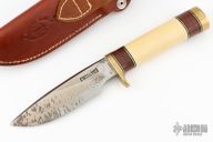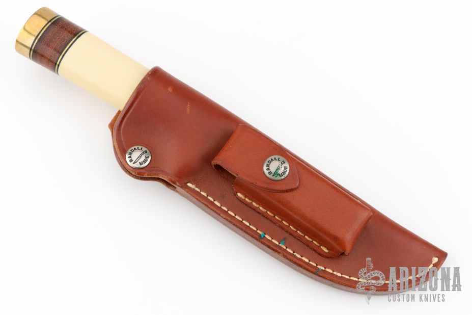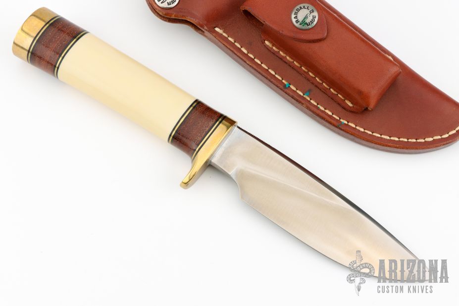 The Model 25-5 by Randall Made Knives is a drop point hunter similar to Model 11, but handle construction is reminiscent of 1930′s design. Excellent skinning, outdoors knife. This knife has a satin finished blade with notched thumbrest, .187" blade stock and 1.298" blade depth, hidden tang construction. The handle brass guard and pommel, ivory paper micarta grip with stacked leather, black and brass spacers. Comes with brown leather sheath. Has rust on one side of the blade, otherwise good user condition.