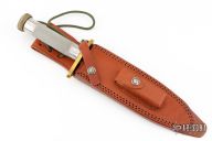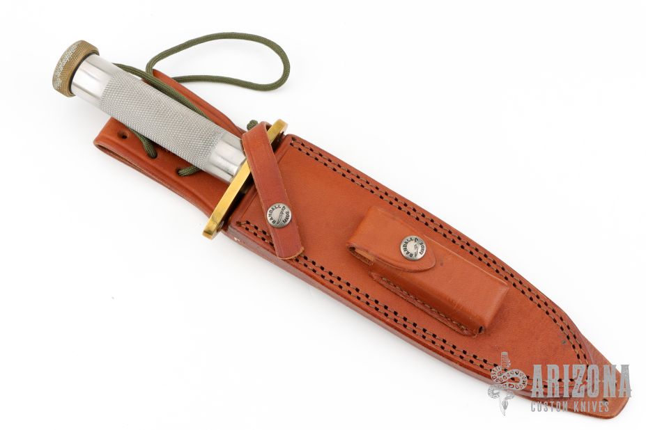 This Model 18-5.5 Attack Survival from Randall Made Knives has a spear point blade with sharpened top edge and sawteeth, .219" blade stock and 1.357" blade depth, hidden tang construction. The handle has a brass guard and knurled butt cap with compass, knurled stainless steel handle. Comes with a brown leather sheath. Has a small oxidation spot on the blade, otherwise excellent condition. Has "UPAYO" on the blade.