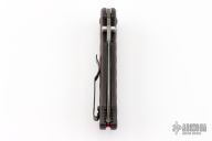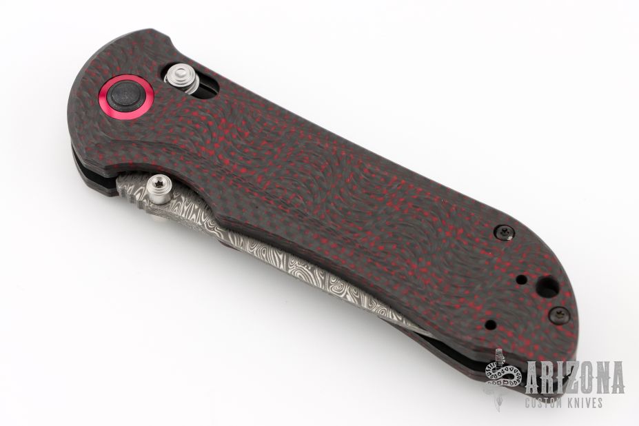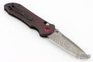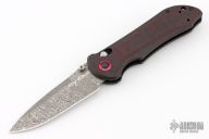 This Gold Class Stryker II from Benchmade features a drop point Odin Heim pattern Damasteel blade with swedge and dual thumbstuds. The handle is comprised of carbon fiber scales over blackened stainless steel liners and red anodized aluminum barrel spacers with matching pivot collar. Reversible tip up stainless steel pocket clip. Numbered #313 on the blade. Includes original box and paperwork. Excellent condition.