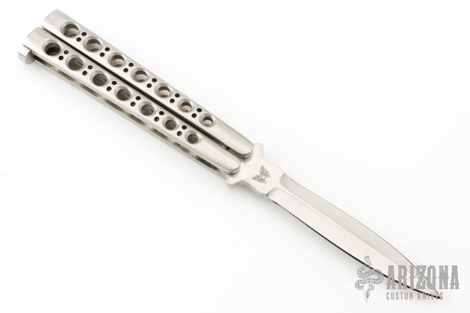This early balisong from Pacific Cutlery features a Jody Samson ground satin finished double edged blade. The handles are stainless steel with hole pattern. Comes with nylon velcro sheath. Has a couple light scratches, otherwise excellent condition.