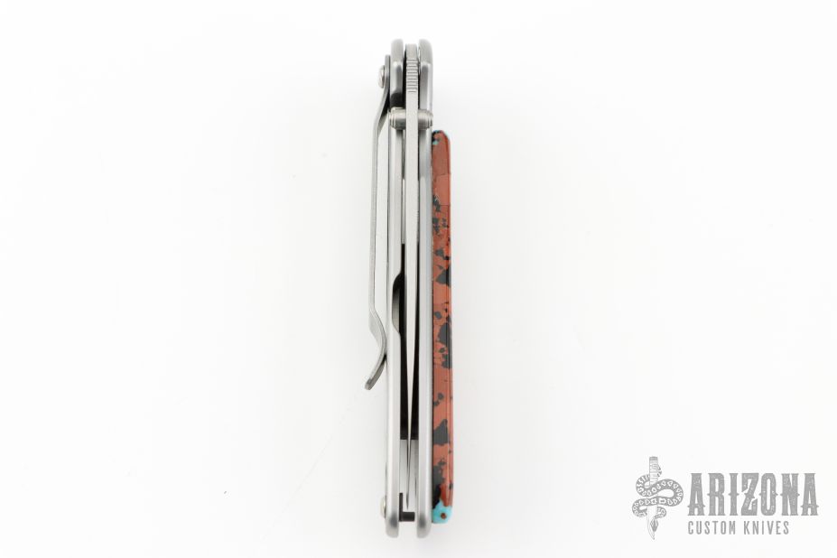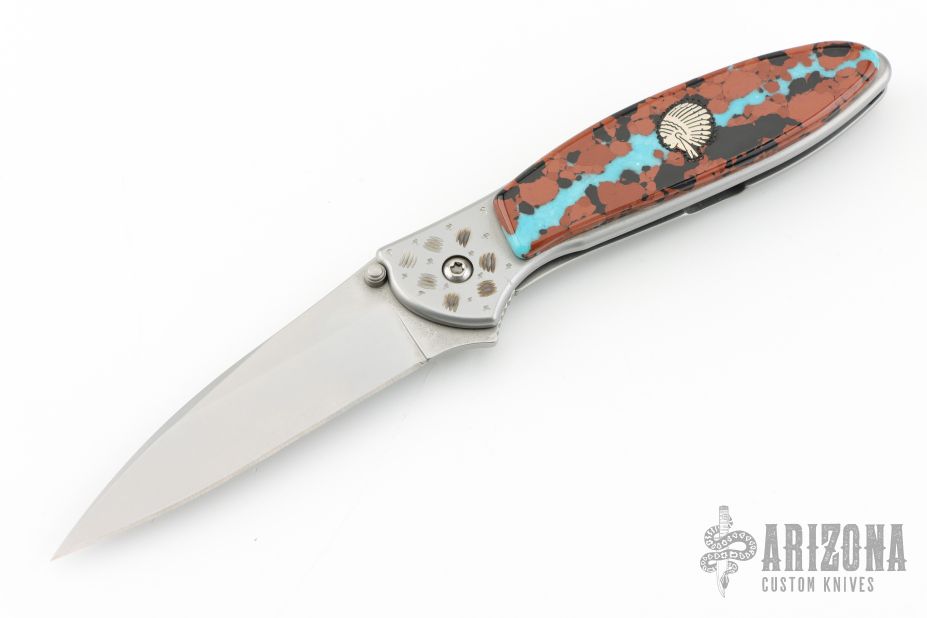 This kershaw assisted opening flipper has been customized by Brian Yellowhorse and is 1of50. It features a bead blasted blade with flipper, assisted opening. Bead blasted stainless steel frame, turquoise and nickel silver overlay by Brian Yellowhorse and a tip up or down stainless steel clip. Nice detent, lockup and blade seating. Excellent condition. Comes with original box and papers. Box is signed by Brian Yellowhorse.