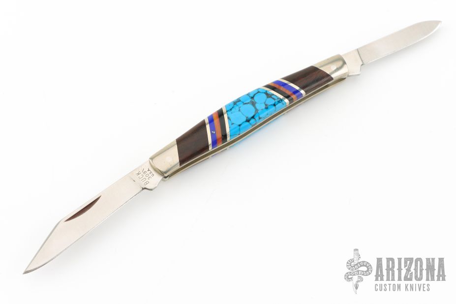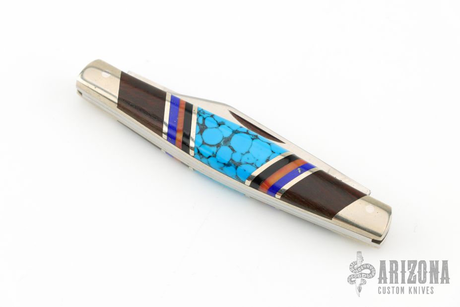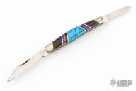 This slipjoint by Buck has been customized by David Yellowhorse. It has satin finished blades with nail nicks. The handle has nickel silver bolsters with integral liners, stainless springs, inlays with ironwood, turquoise, Lapis and coral spacers. Excellent condition. Comes with original box and papers.