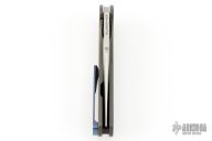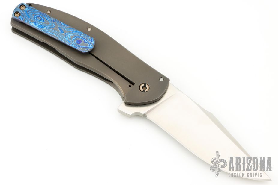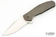 This Large Bear Flipper features a satin finished blade with flipper. The handle has a tumbled and anodized titanium frame with black timascus tip up clip and a carbon fiber backspacer, has a lanyard pin. Nice detent, lockup and blade seating. Excellent condition. Comes with a zippered case.