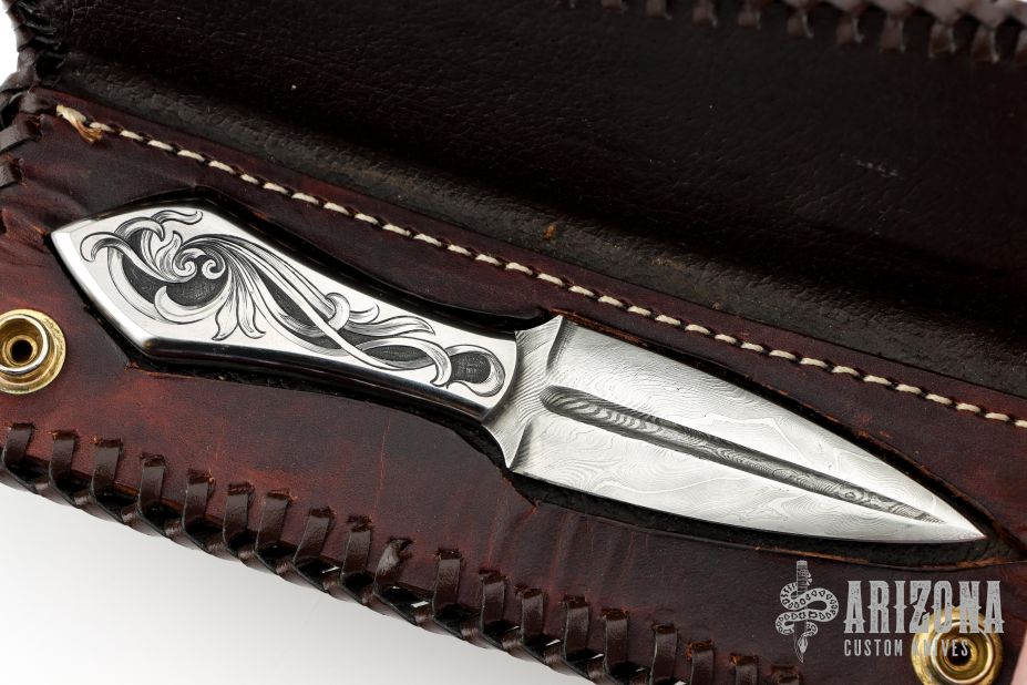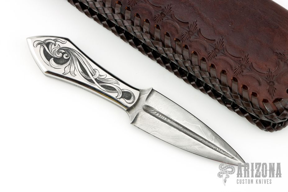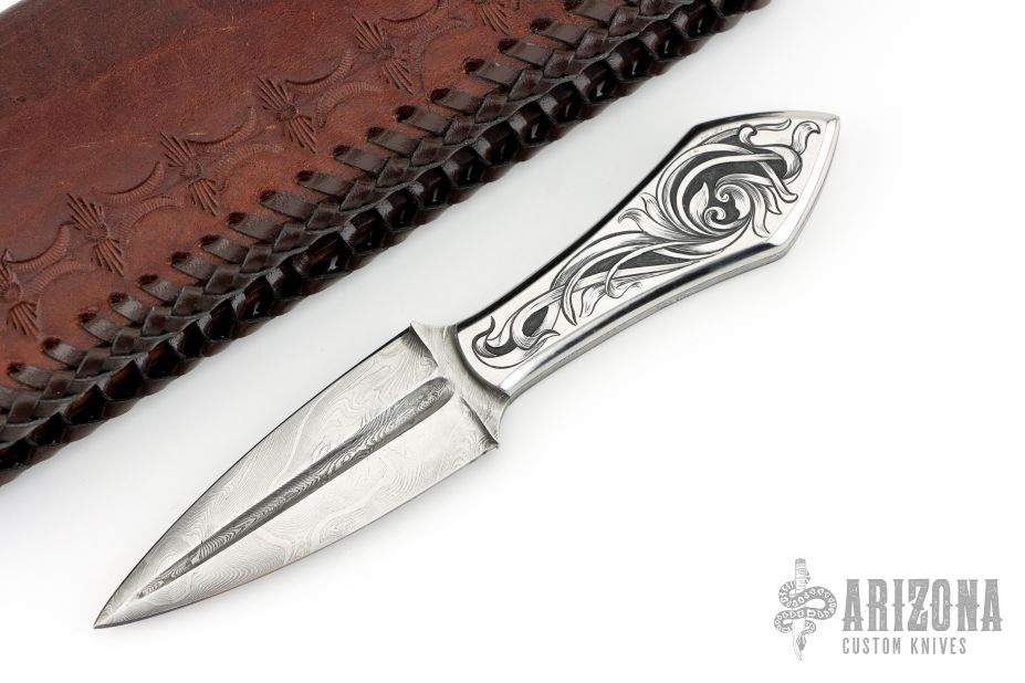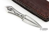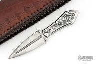 This Dagger by Jodi Muller features a double edged Damascus (1095 and L6) blade with fullers, .137" blade stock and 1.003" blade depth, full tang construction. The handle has 416 stainless steel scales that were engraved by Jodi. Comes with a hand tooled brown leather wallet sheath. Excellent condition.