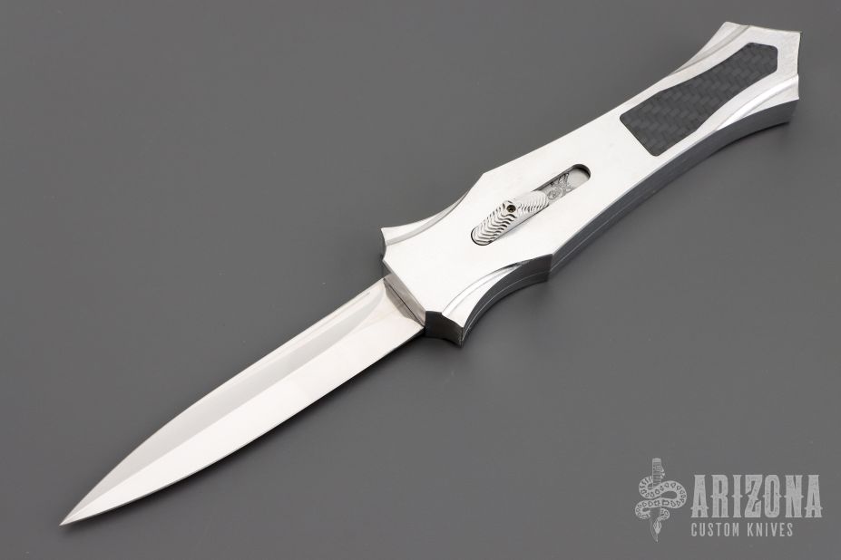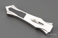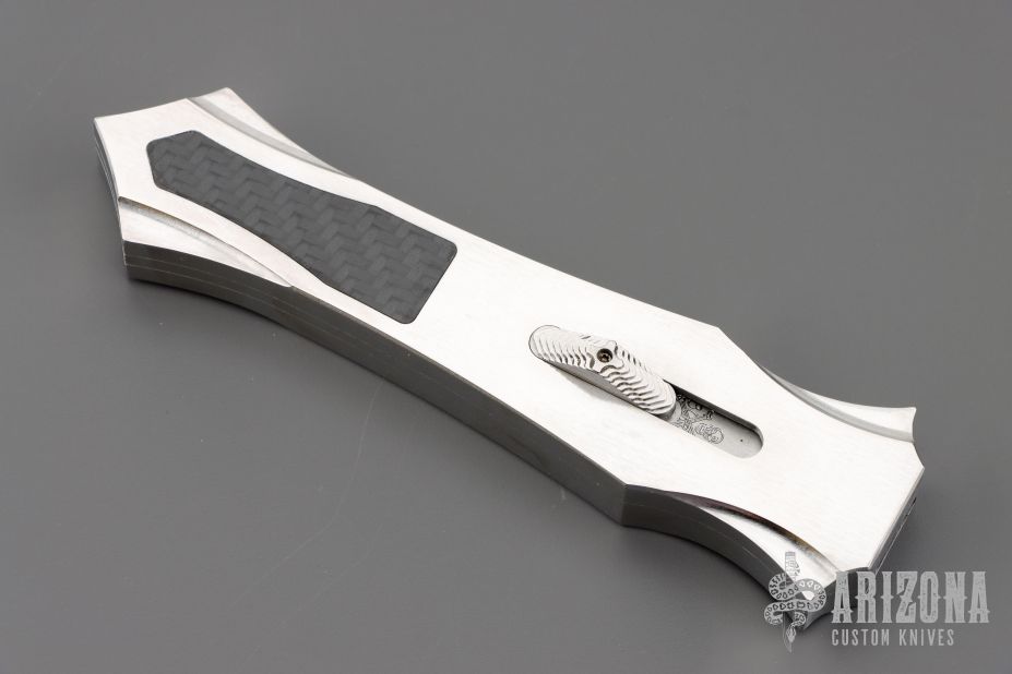 This Burn Custom Stingray OTF has a hand rub satin finished hollow ground double edged blade. The chassis is cut from 416 stainless steel with a satin finish, has 3k Carbon Fiber inlays. Blade deploys with authority and locks up tight with minimal blade play. Has a few light scratches, otherwise excellent condition. Comes with a zippered case and COA dated 11-28-18