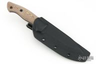 Has a black cerakote blade with .190" blade stock and 1.400" blade depth, full tang construction. The handle has tan canvas micarta scales with black hardware and a lanyard hole.