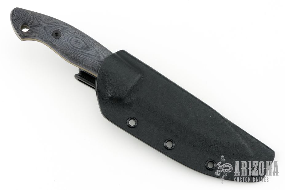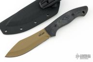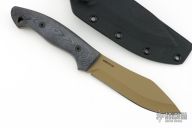 Has a tan cerakote blade with .190" blade stock and 1.400" blade depth, full tang construction. The handle has black canvas micarta scales with black hardware and a lanyard hole.