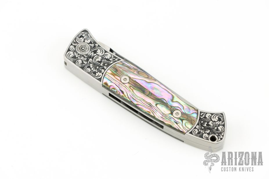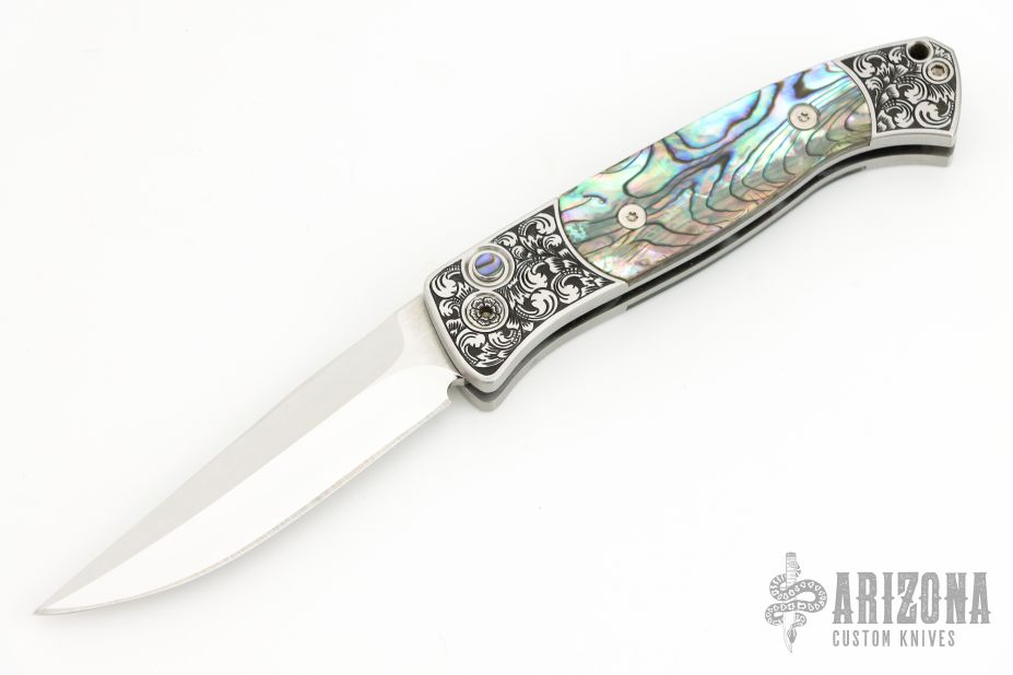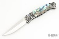 This Brend Auto #2 by Pro-Tech Knives features a mirror polished clip point blade with swedge. The handle has a stainless steel frame with abalone inlays and abalone inlaid button. Lanyard hole in pommel. The frame has been engraved by Bruce Shaw. Excellent condition. Comes with a Pro-Tech box.