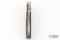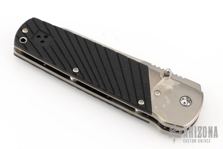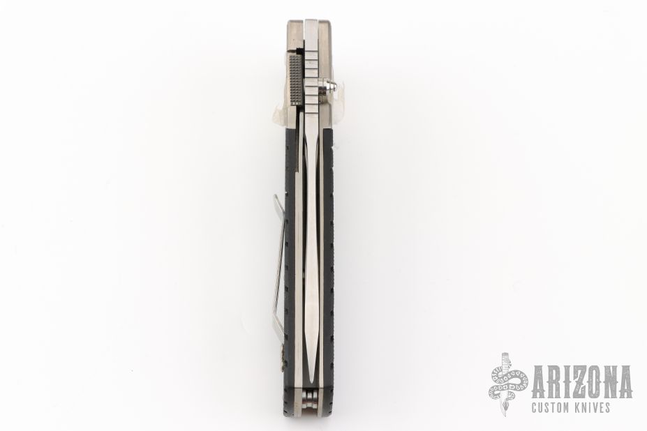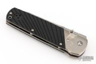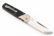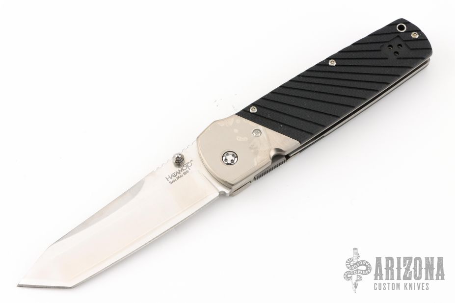 This Hatamoto linerlock by Cold Steel has a high satin finished San Mai III stainless steel tanto blade with dual thumb studs and notched thumb rest. Handle is black G10 over titanium liners and satin finished titanium bolsters. Stainless steel tip up reversible clip and lanyard hole. New condition. Comes with original box and aluminum case. Still has the protective covers on the bolsters.