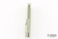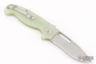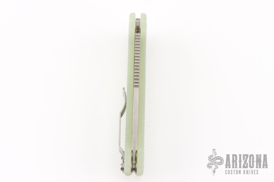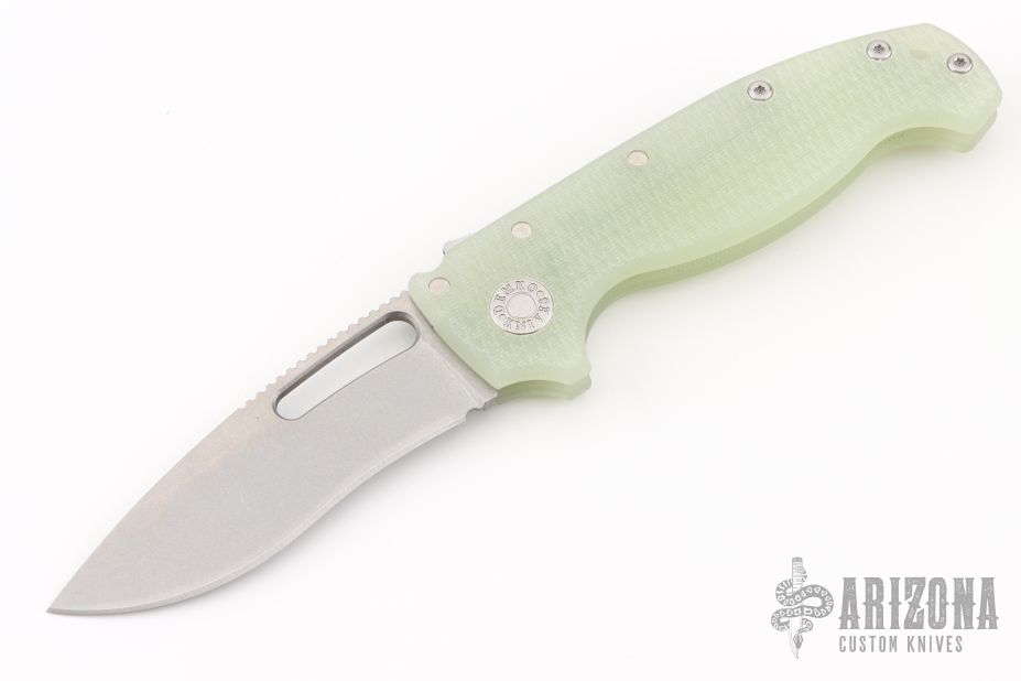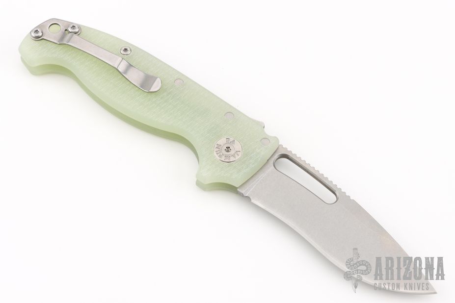 This AD20S by Andrew Demko features a stonewash finish blade with notched thumbrest, thumbhole and dual thumbstuds. The handle has a natural G-10 frame with a tip up stainless steel clip and "Shark" lock release on the spine.  Comes with original box. New Condition.