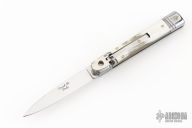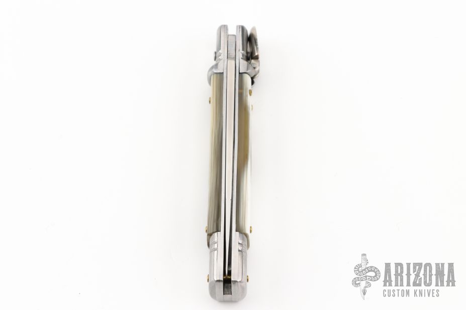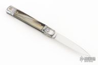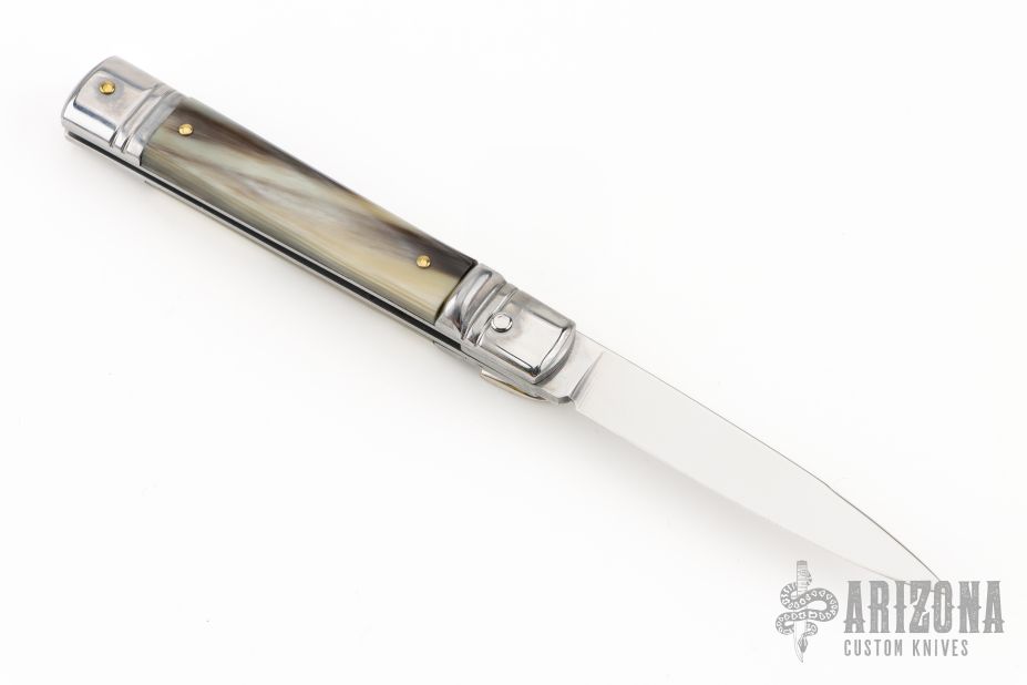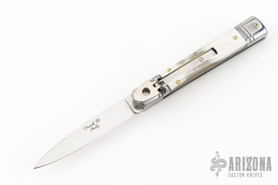 This leverlock Auto by Frank Beltrame features a mirror polished blade. The handle has fluted stainless steel bolsters, horn scales, stainless steel liners and backspacer. Nice action, lockup and blade seating. Excellent condition.