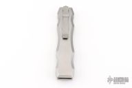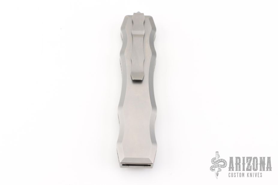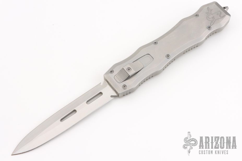 This Brand New Sand Shark OTF double action automatic by Desert Knife Works features a satin finished double edge blade and a bead blasted stainless steel handle with matching tip down clip. Comes with original tube and pouch. New from maker.