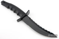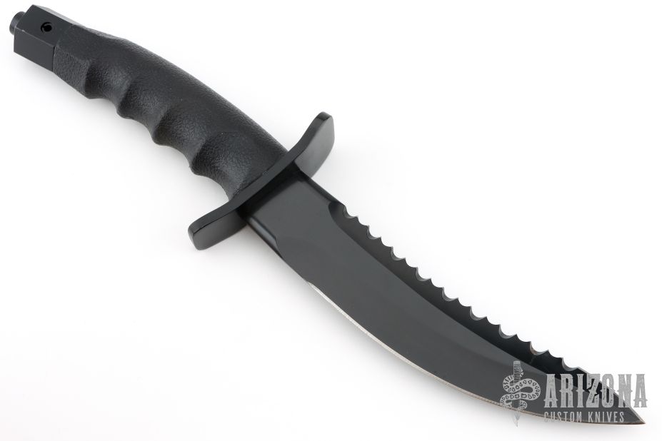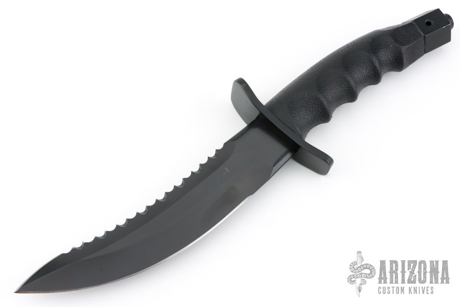 This Black Warrior from Al Mar Knives features a black coated blade with serrated top edge, .240" blade stock and 1.490" blade depth, hidden tang construction. The handle has a black stainless steel double guard, black rubberized handle, and a black stainless steel butt. Comes with a zippered case. Has some scratches and some minor wear on the finish, otherwise good condition. The makers mark is not visible on the front of the blade but you can still see "JAPAN" on the other side.