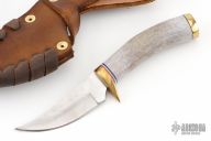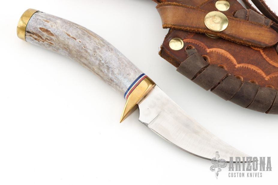This small skinner by Ken Richardson features an upswept blade with jeweled flats and satin grinds, .095" blade stock and .955" blade depth, hidden tang construction. The handle has a brass guard and butt, stag grip, red/white/blue spacers. Comes with a hand tooled brown leather sheath. Excellent condition.
