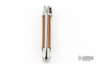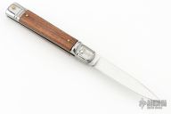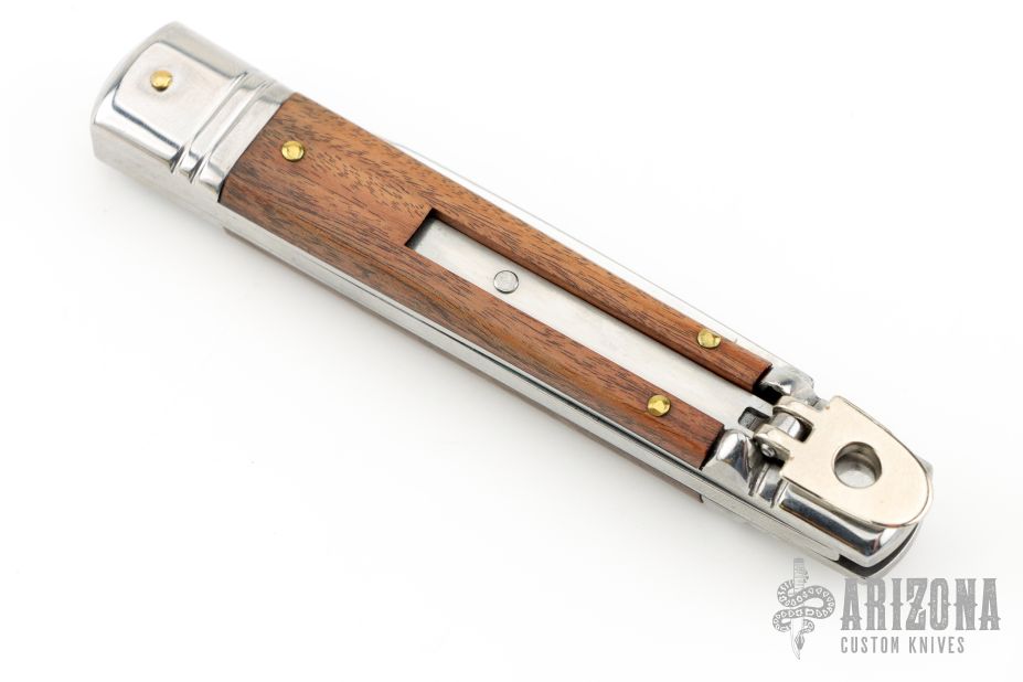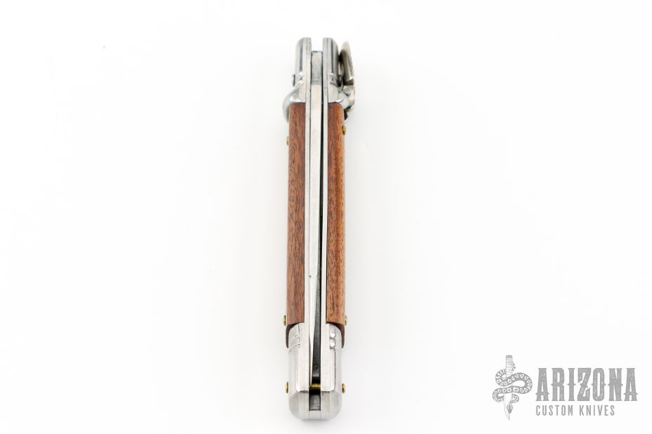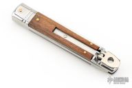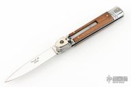 This leverlock Auto by Frank Beltrame features a mirror polished blade. The handle has fluted stainless steel bolsters, wood scales, stainless steel liners and backspacer. Nice action, lockup and blade seating. Excellent condition.