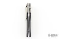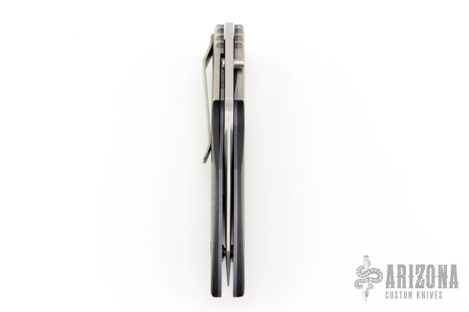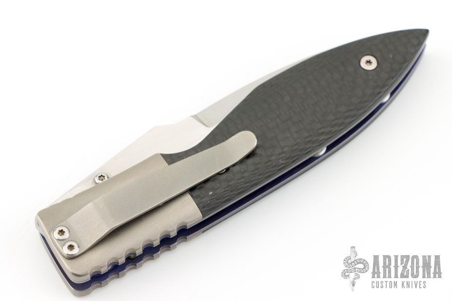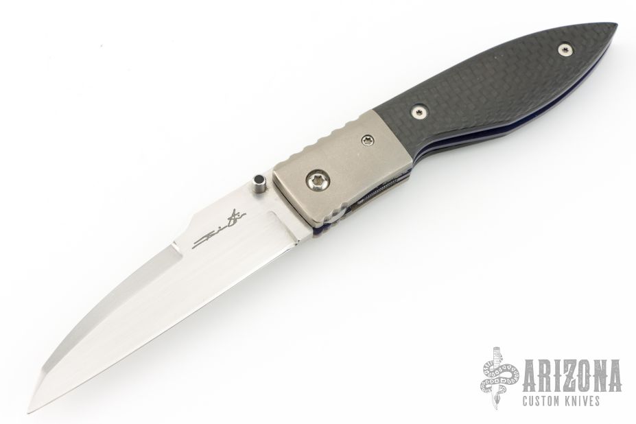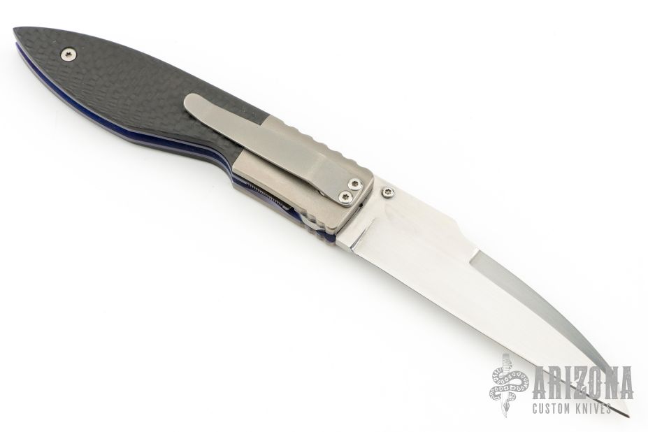 This Pinnacle by Brian Tighe has a hand rub satin finished blade with single thumbstud. The handle has bead blasted titanium bolsters, carbon fiber scales, anodized titanium liners, tip down bead blasted titanium clip. Nice detent, lockup and blade seating. Has some light scuffs and scratches, otherwise good condition.