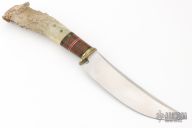 This Scagel Style Hunter by SCAR Knives features a satin finished convex ground blade with a false top edge, .193" blade stock and 1.290" blade depth, hidden tang construction. The handle has a brass guard, crown stag grip with brass pins, black/brass/leather/nickel silver/red spacers. Has some light oxidation spots near the top, otherwise excellent condition.