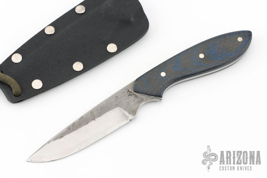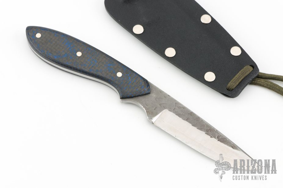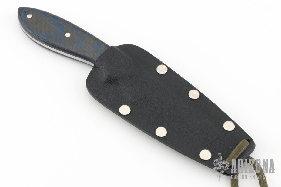 This neck knife by Murray Carter features a laminated blade with polished grinds, forged finished flats and a full tang construction, .130" blade stock, and .857" blade depth. The handle has black/blue carbon fiber scales.  Includes a kydex sheath. Has some light scratches, otherwise excellent condition.