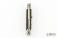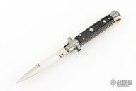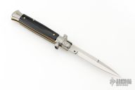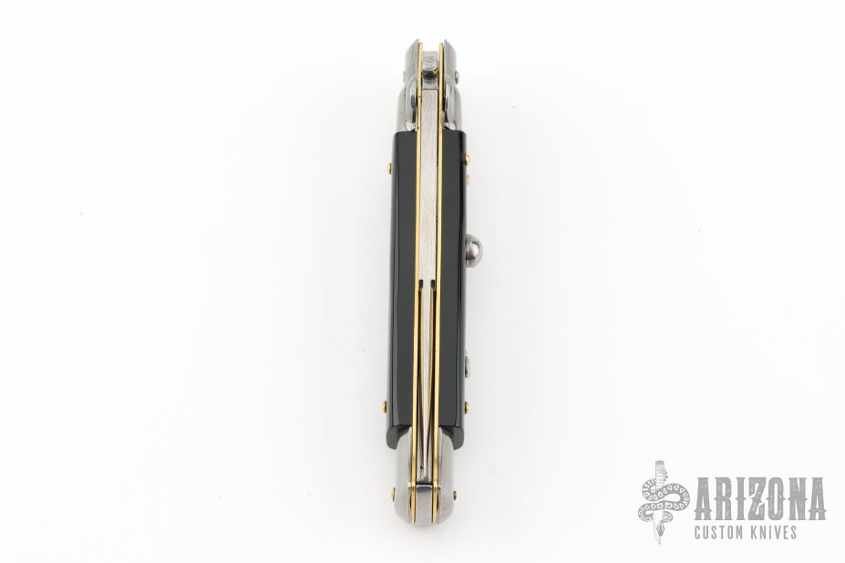 This Swivel Bolster by Frank Beltrame features a polished bayonet ground blade with false top edge. The handle has stainless steel bolsters, front and rear, black scales, brass liners, stainless spring. Excellent condition.