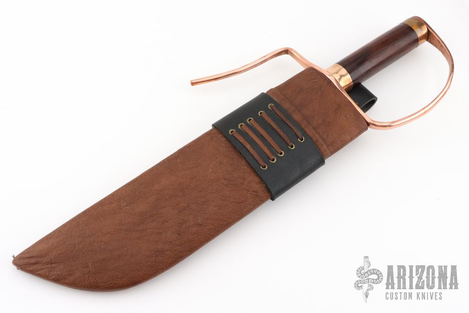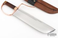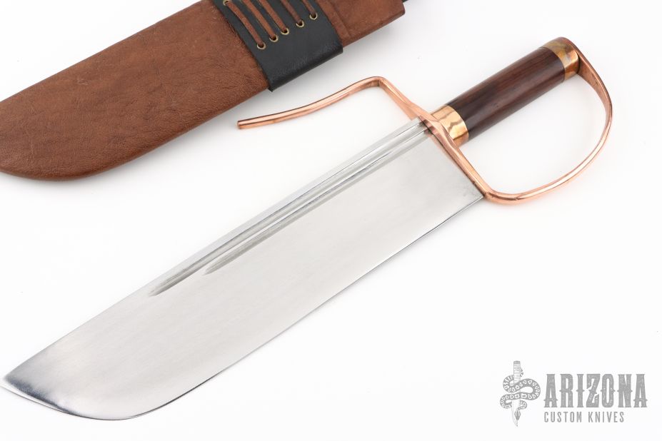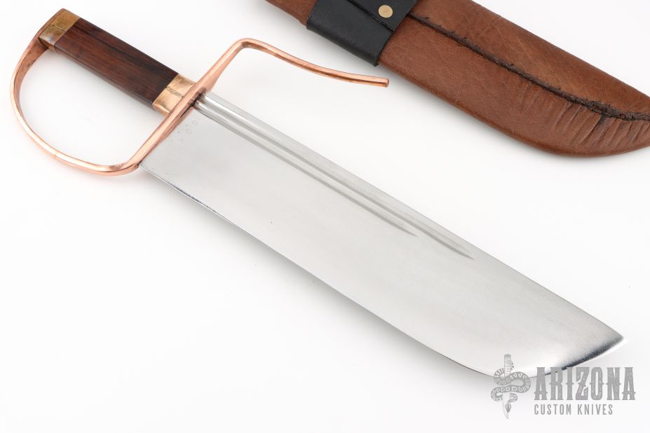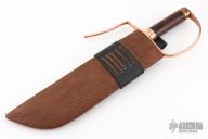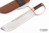 This Butterfly Sword by G.G.K. features a satin finished blade with fullers, .220" blade stock and 2.810" blade depth, hidden tang construction. The handle has a copper D-guard, rosewood grip and brass bolsters. Comes with a black/brown leather sheath. Has some light scratches, otherwise excellent condition.
