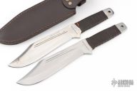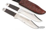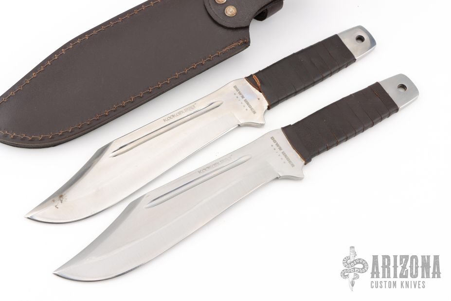 The Kookaburra comes as a set of two knives in a patterned heavy leather sheath that takes up no more valuable belt space than any quality hunting knife. The Kookaburra 440C stainless blade is heat treated to approximately RC52 to withstand the stress of repeated impacts, yet it still maintains a sharp edge so it can be used as a proper utility knife, unlike most throwers on the market today. Comes with origianl box and brown leather sheath that holds both knives. The blades have a couple rust spots, otherwise good condition.