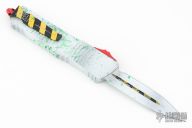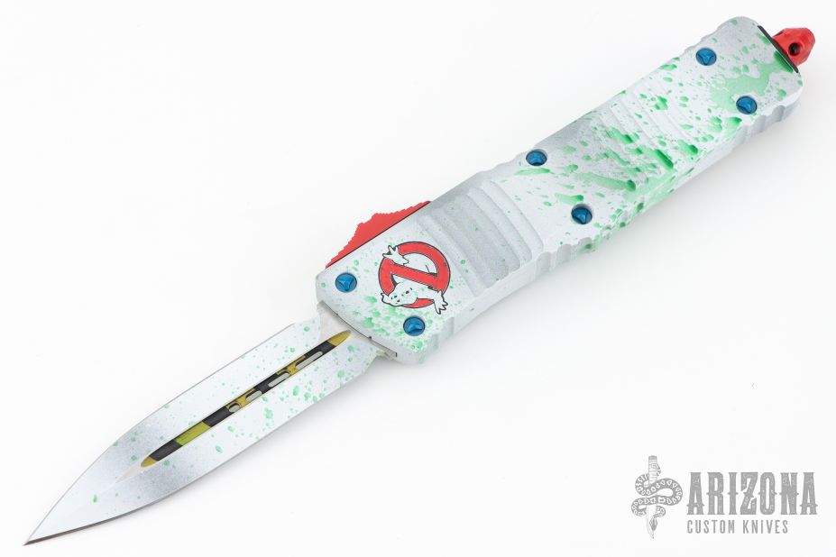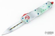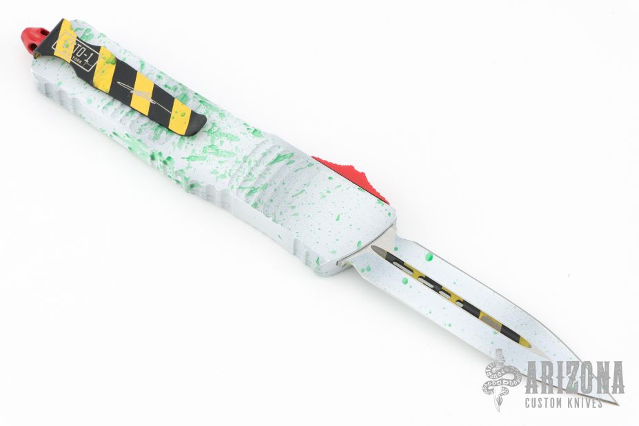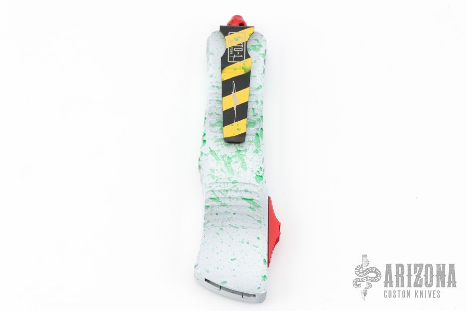 This Combat Troodon OTF automatic by Microtech knives features a Slime white double edged blade, and a Slime white aluminum handle with blue and red hardware, tip down clip. Glass breaker. Comes with original box and papers. Excellent condition.