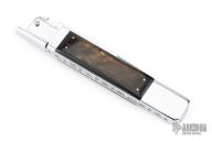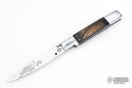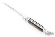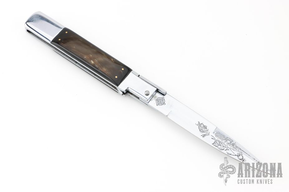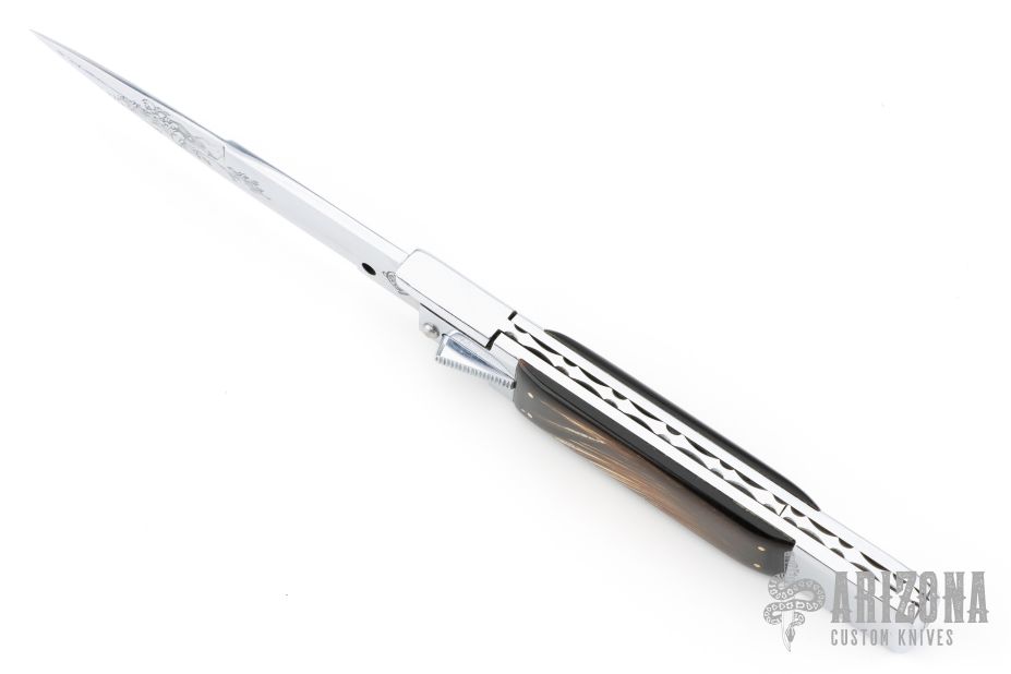 This Picklock Auto by Agasi Hambartsumian of Armenian Doctor Knives features a mirror polished bayonet ground blade with a false top edge. The handle has a polished stainless steel frame with fileworked stainless steel backspacer, buffalo horn scales with brass pins. New from maker.