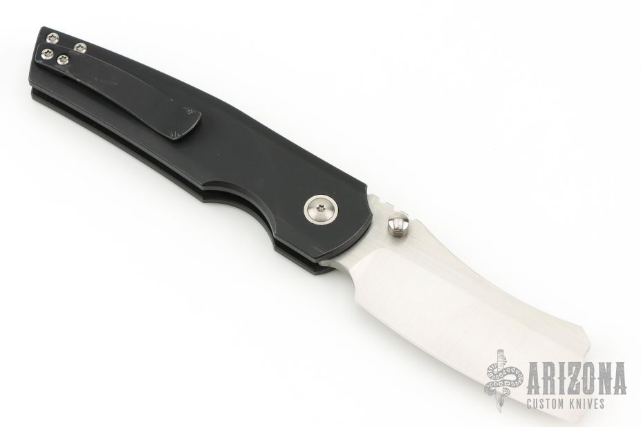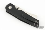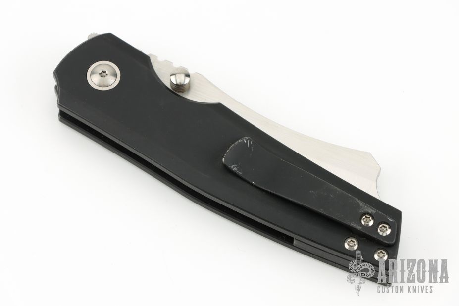 This Production Barber by Berg Blades features a satin finished blade with notched thumbrest and dual thumbstuds. The handle has a black stonewashed titanium frame with a satin pivot collar, and a black stonewashed tip-up clip. Nice detent, lockup and blade seating. Includes the original box. Has some scratches on the clip, otherwise excellent condition.