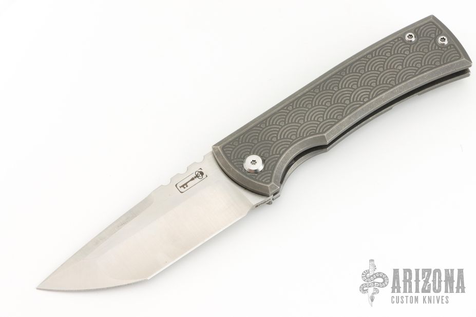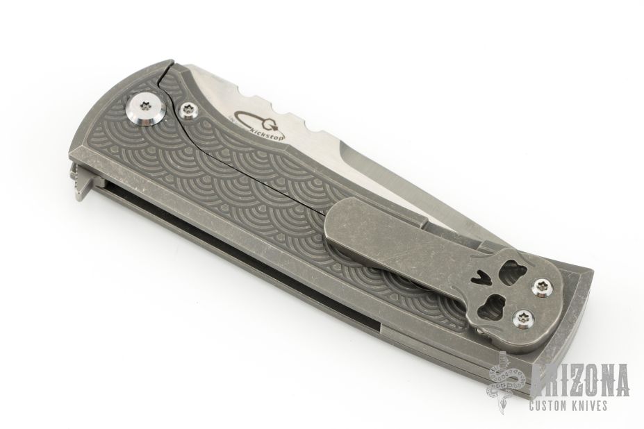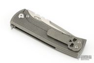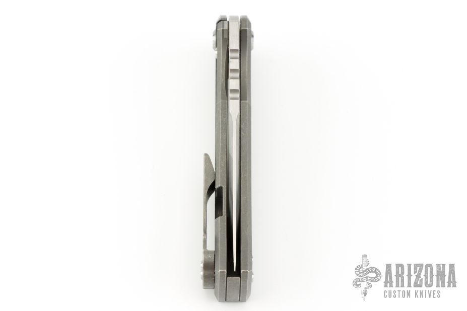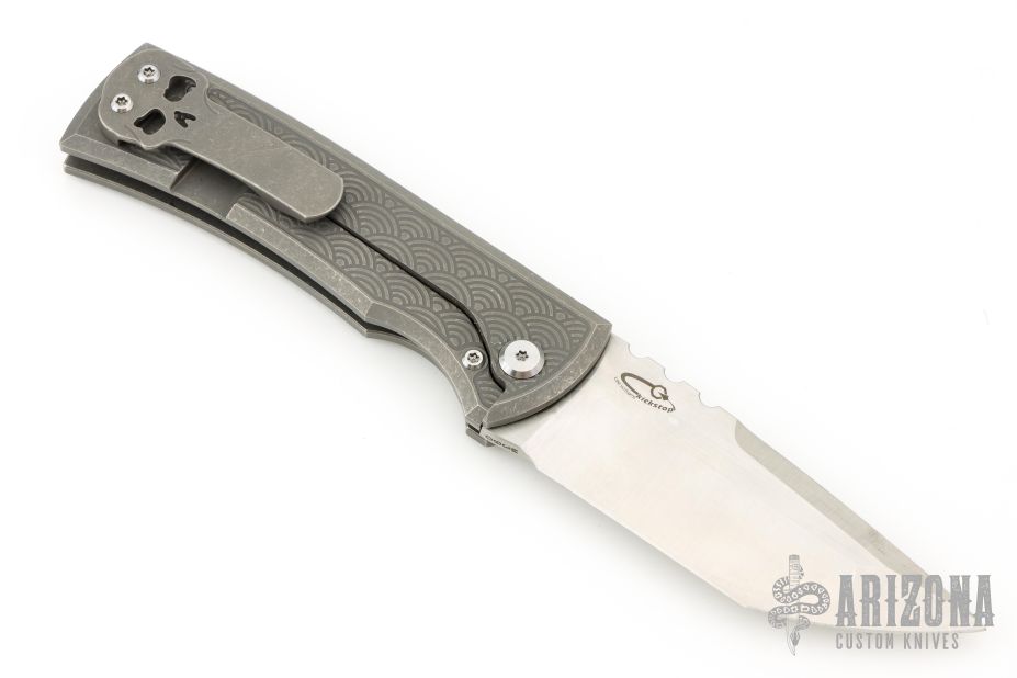 This Chaves Ultramar Redencion Tanto features a satin finished blade. The handle is made up of stonewashed titanium, skull pocket clip (positioned for tip up carry), and a matching titanium backspacer. Comes with original box and an extra regular titanium pocket clip. The knife opens with the use of Lee Williams' Kick Stop flipper.  Includes the original box and extra clip. Excellent condition.
