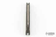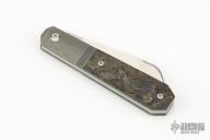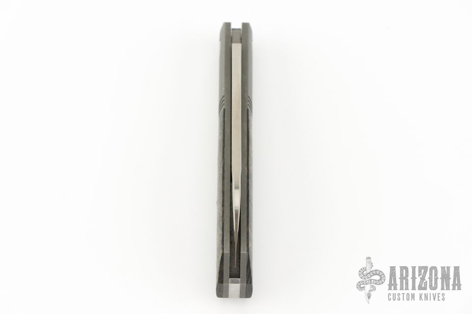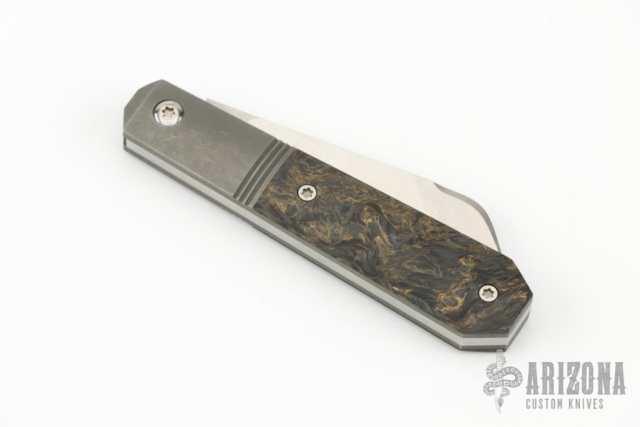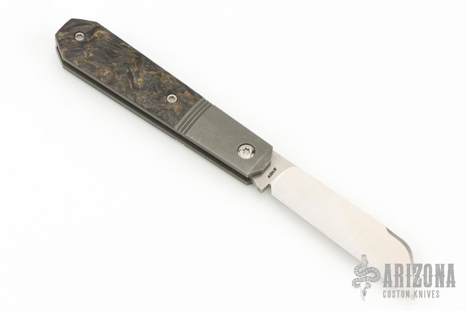 This Midnight Jack is a Barlow (Coffin) slipjoint model by Jack Wolf Knives featuring a hand satin finished sheepsfoot blade with longpull. The handle has integral bead blast finish pinched and fluted titanium front and rear bolsters and liners, carbon fiber scales with a stainless spring. Comes with box, metallic tube with J.Gonzo artwork, leather slip, sticker and microfiber cleaning cloth. Has some light scuffs and scratches, otherwise good condition.