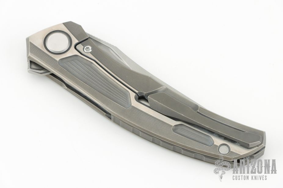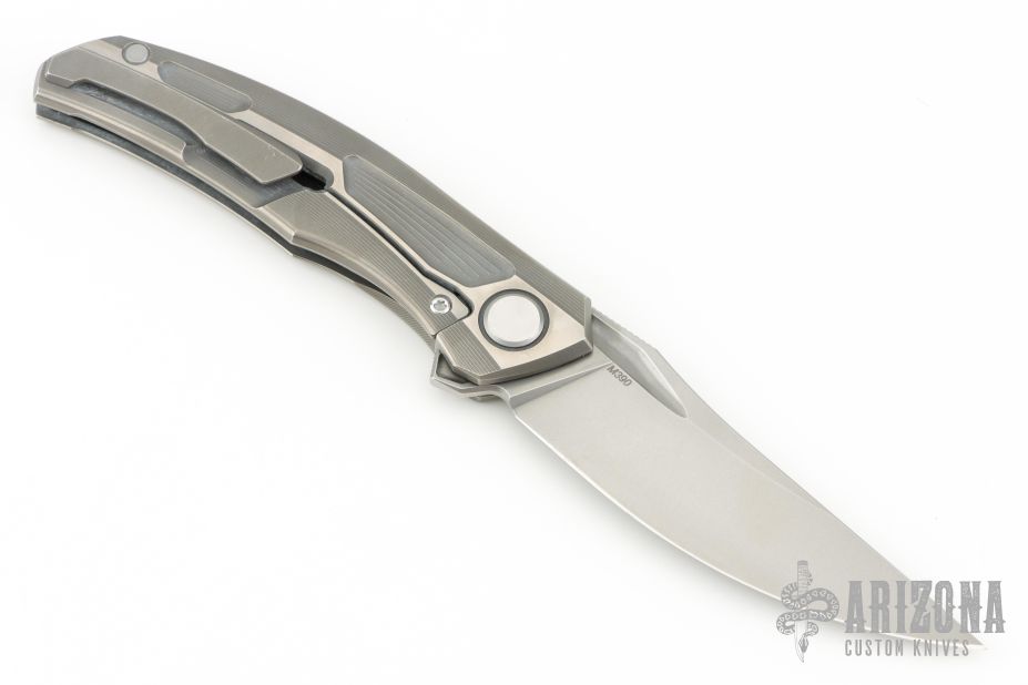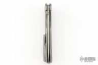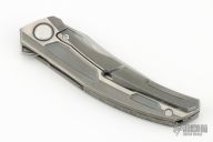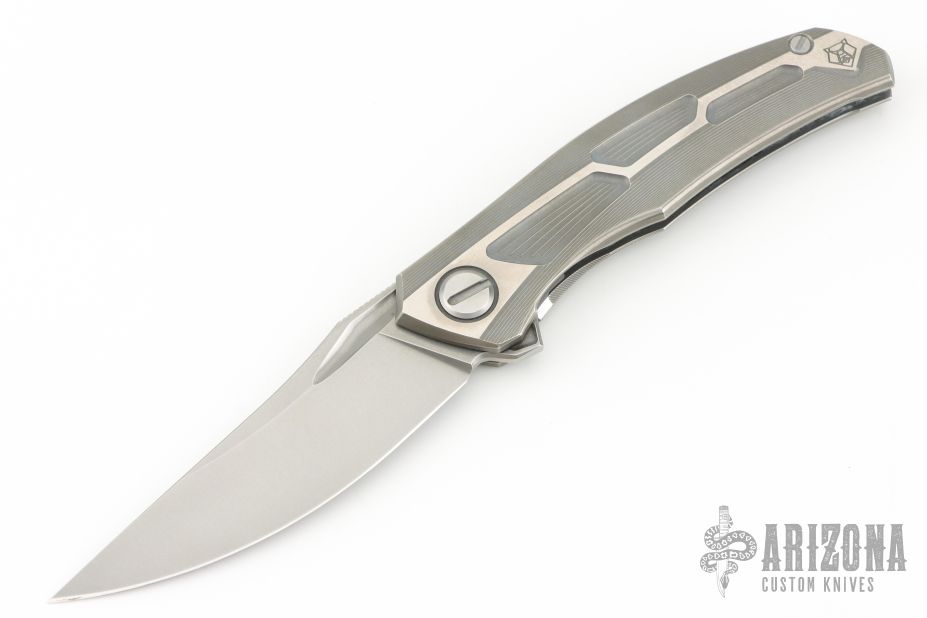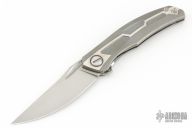 This Quantum Gen2 by Shirogorov features a blasted blade with notched thumbrest and flipper. The handle has a blasted and milled titanium frame, backspacer, tip up titanium clip with hidden screws. Rides on MRBS, nice detent, lockup and blade seating. Comes with original box and COA. Has some scuffs and scratches, otherwise good condition.
