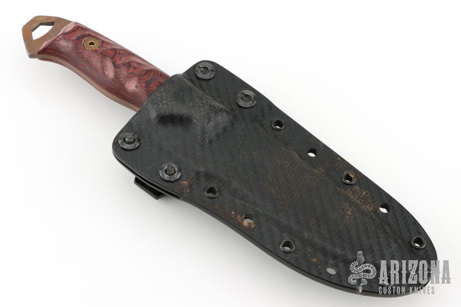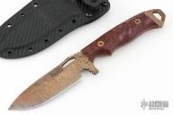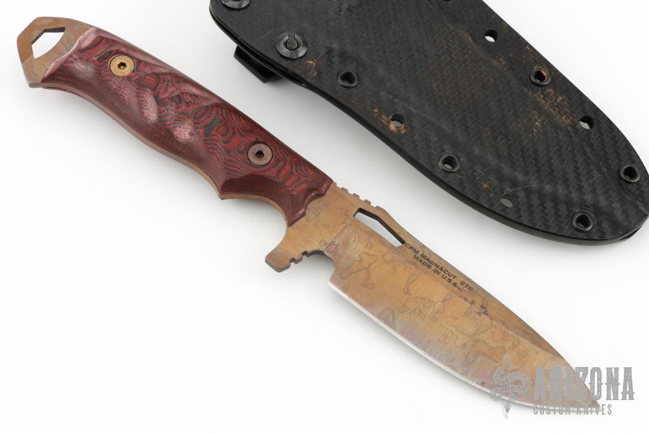 This Nomad by Dawson Knives features an Arizona Copper finished blade with notched thumb and finger rests, .141" blade stock and 1.260" blade depth, full tang construction with black/red G-10 scales. Comes with a kydex sheath and a COA dated 2-19-24. Excellent condition.